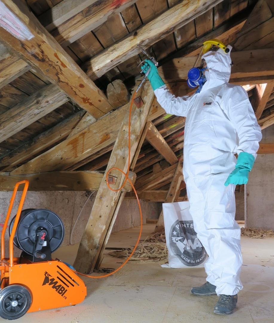 Cette étape a pour but de créer, à l’intérieur des éléments de charpente, des zones actives insecticides, afin de détruire les larves et les insectes que le traitement de surface ne pourrait atteindre.